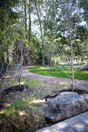 The property currently has a walking trail and will ultimately have a pavillion and raised beds. The landscaping was done by volunteers, a local group of Eagle Scouts and their families, led by Levi Bohne and his father Jason Bohne. The materials for the project were donated by Acadia Landscaping, and the landscape design was donated by Michael Versen & Associates.